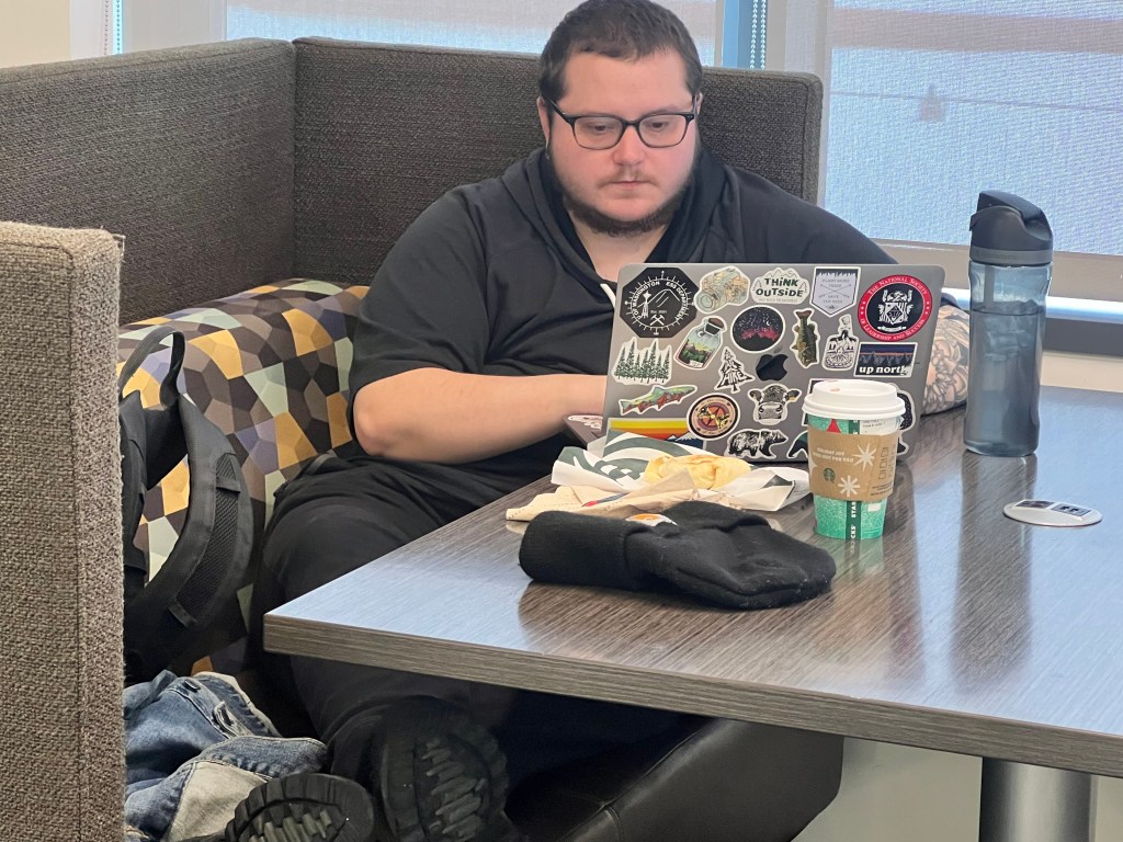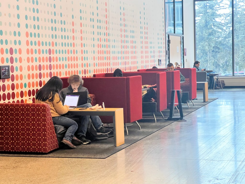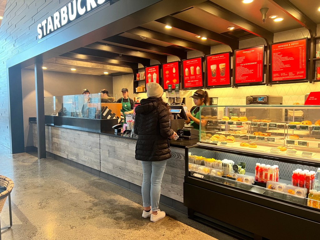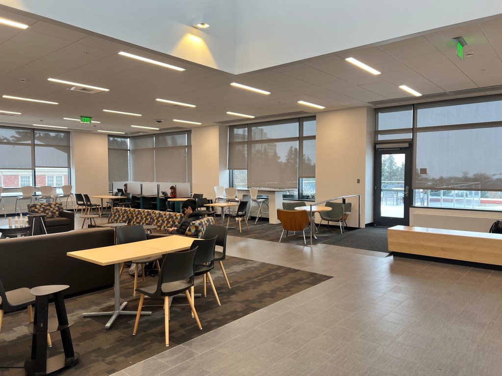 Across from the Starbucks sits students studying between classes while enjoying breakfast or a snack.