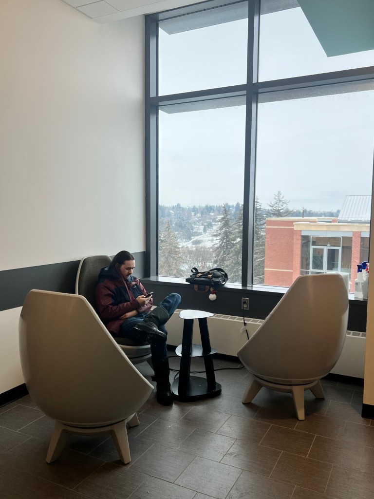 A student scrolls through his phone in a reading nook on the third floor of The Spark. This particular nook is common for reading undisturbed or watching the sunset over downtown Pullman.