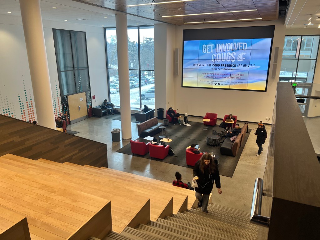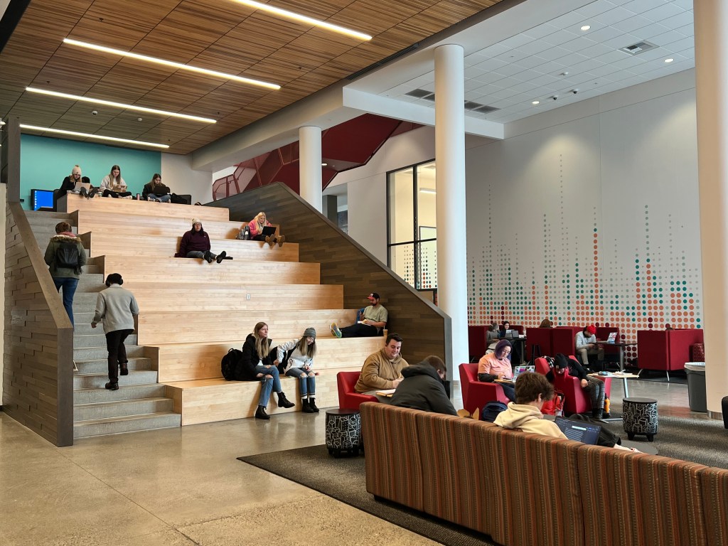 Across from a large wall of screens, sits enormous stairs for students to gather for lectures, meetings, and even movie nights. Students gathered to study and enjoy the time before class.