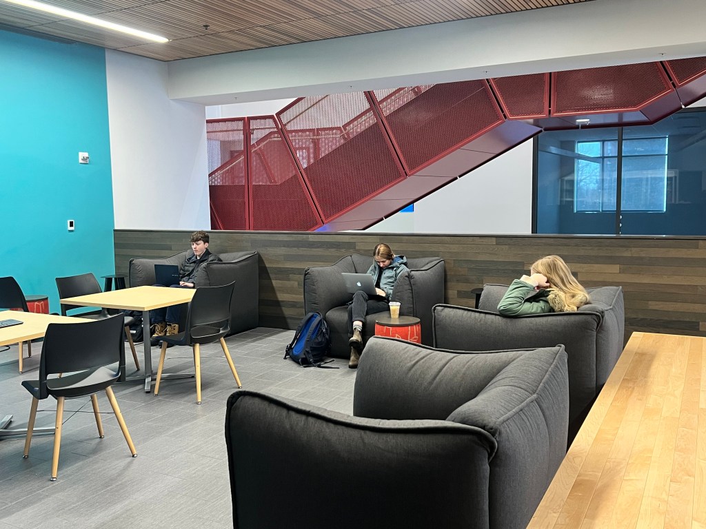On the third floor of the Spark has two large sections where students can gather as groups or individually to get work done. These are separate from the classrooms and study rooms on that level.