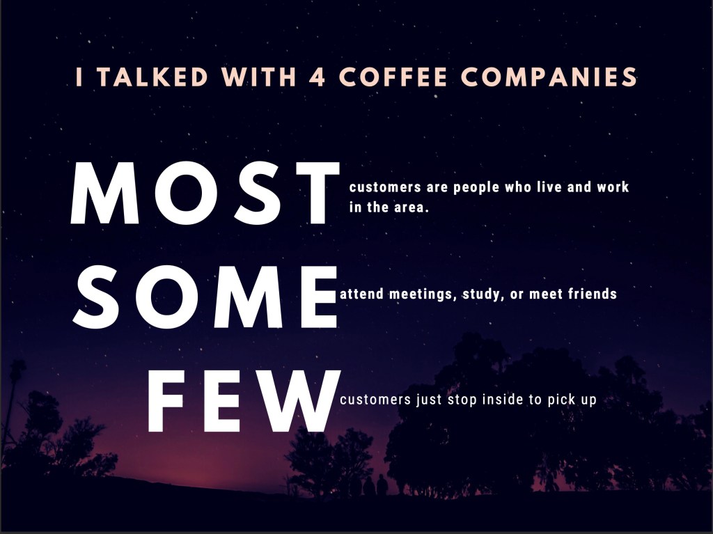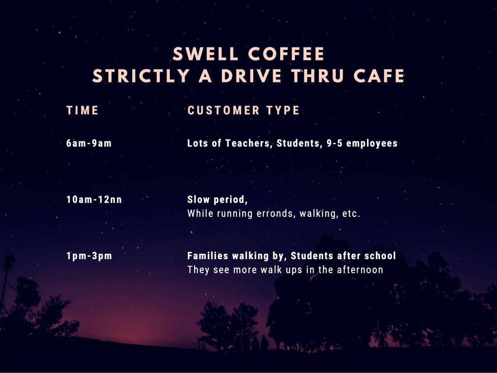I talked with Amanda at Swell Coffee about what kinds of customers that they see. Swell Coffee’s busiest hours are early in the morning as people are going to school or work.